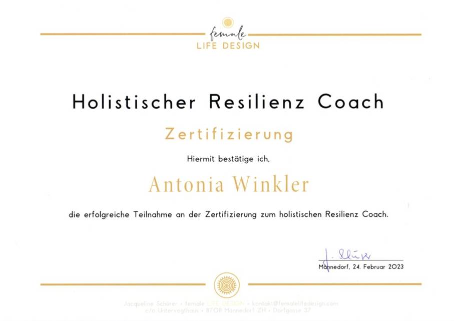 - Zertifizierter Holistischer Resilienzcoach (2-jährige Ausbildung „Female LIFE Design by Jacqueline Schürer“)