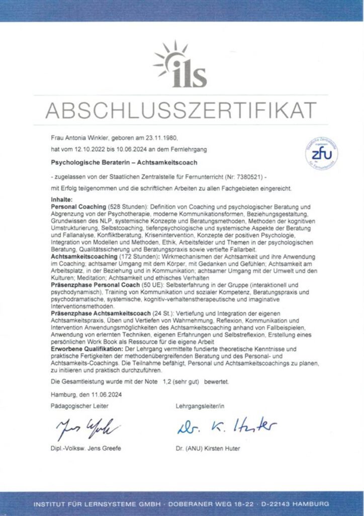 - Zertifizierte Psychologische Beraterin – Achtsamkeitscoach (21-monatige Ausbildung „ILS – Institut für Lernsysteme GmbH“)